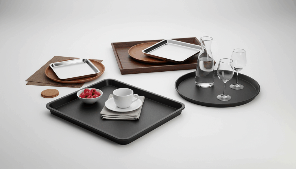 Bakker og underlag samler et bredt udvalg af løsninger til servering og borddækning. Kategorien rummer bakker i forskellige størrelser og former – rektangulære og runde – samt underlag og tilbehør, der gør serveringen sikker, elegant og praktisk. Materialerne spænder fra PP og FRP til rustfrit stål og træ, så du kan vælge alt fra enkel funktion til en mere premium finish.