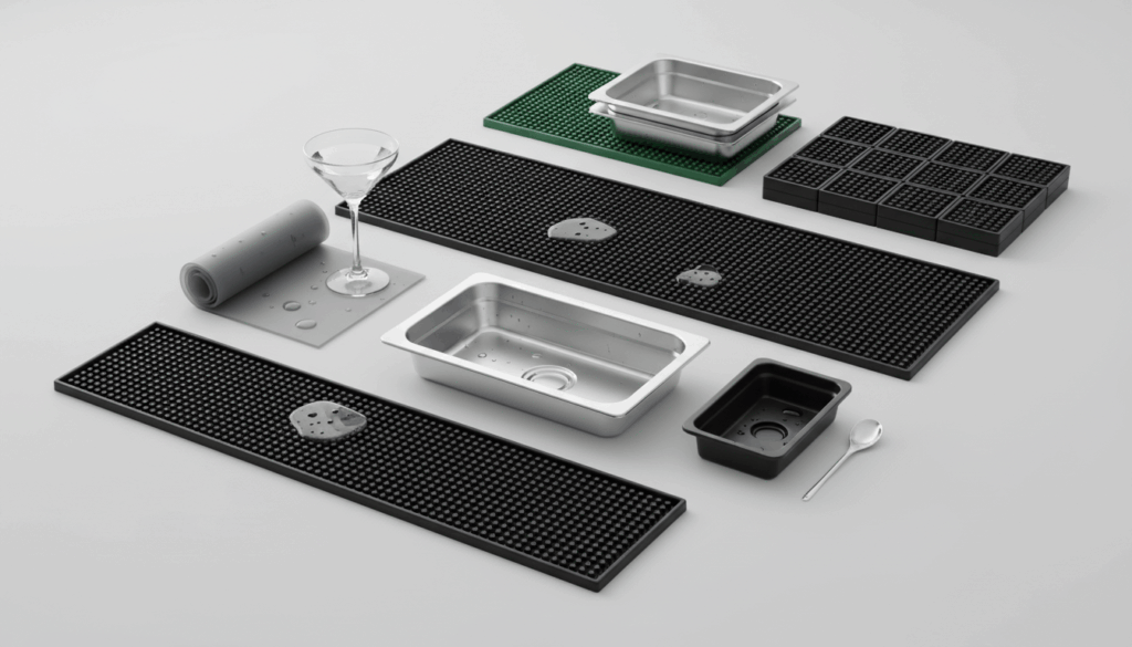 Under kategorien Barmåtter og drypbakker finder du praktiske løsninger til baren og køkkenets arbejdsområder. Barmåtter af gummi eller silikone giver skridsikker, skånsom beskyttelse af bord- og barflader, ofte med kant for at holde spildet tæt. Drypbakker i rustfrit stål eller robust plastik indsamler væske og gør rengøringen nemmere efter service. Sortimentet spænder fra lange barmåtter til mindre hjemmebar-varianter, og nogle modeller er opvaskemaskine-sikre. Ved køb bør størrelse, materiale (gummi vs silicone), antislip-egenskaber og rengøringsvenlighed overvejes.