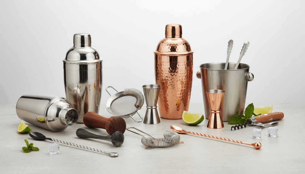 Typiske variationer inkluderer Boston Shaker og Parisian Shaker, jiggers i 20/40 ml eller 25/50 ml, muddler i rustfrit stål eller plastik, samt strainers som Hawthorne og kobber Mezclar. Kobberfinish og træhåndtag giver et elegant look, mens rustfrit stål og plastik giver holdbarhed og nem rengøring. Overvej ergonomi, vægt og vedligeholdelse, og om du foretrækker enkelte værktøjer eller komplette sæt. Kvalitet og tilpasning af finish gør det nemt at matche barens stil.