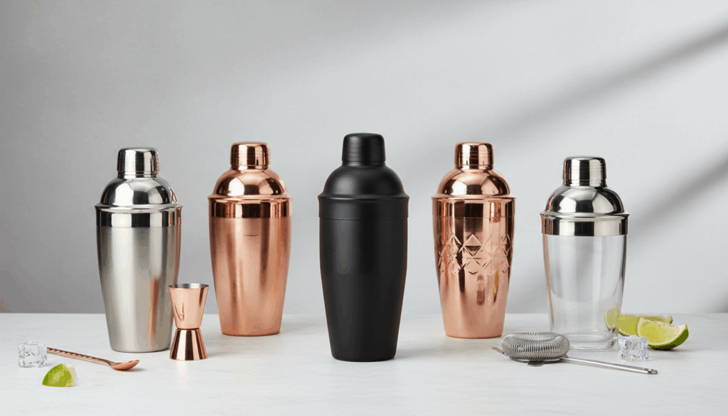 En Boston shaker er hjørnestenen i cocktailfremstilling. Kategoriens produkter spænder fra todelte tin-tin shakere til tre-delte shaker-top modeller i rustfrit stål med finishes som kobberlook, roséguld og sort. Kapaciteterne ligger typisk mellem 0,5 og 1,0 liter og fokuset er tæt pasform og balance ved rystning.