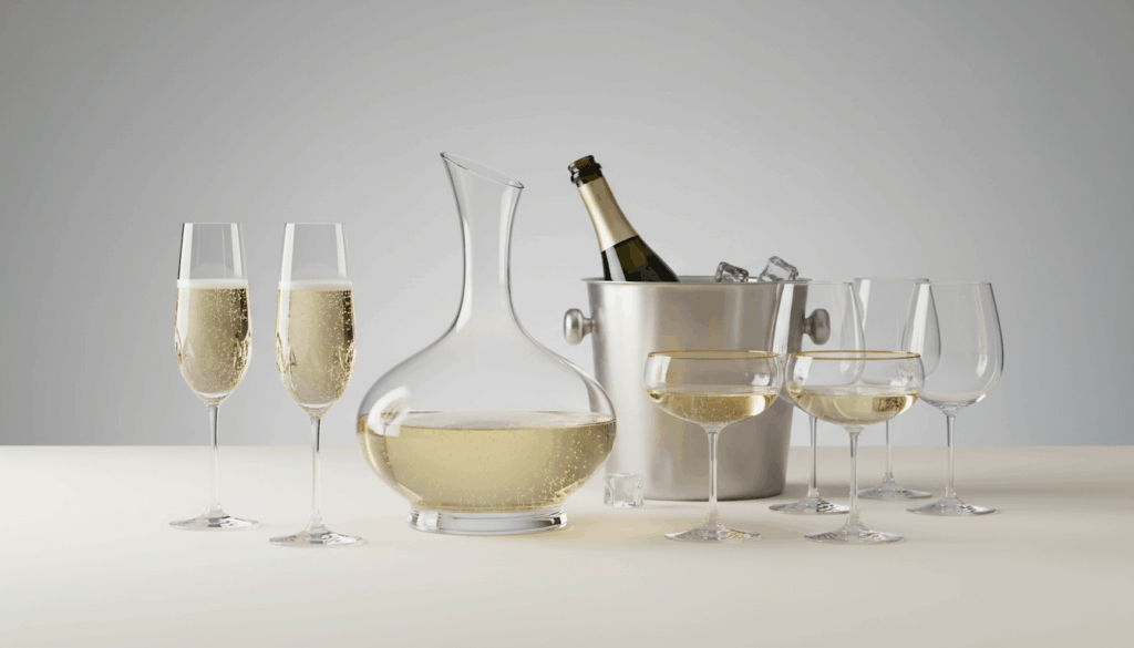 Valg som flute, coupe og tulipanformer giver forskellige aroma- og bobleroplevelser. Glasstørrelser spænder typisk fra 15 til 30 cl, mens karafler og større sæt giver plads til gæster. Materialer spænder fra mundblæst krystal til blyfrit glas, ofte med klare facetter eller håndlavede detaljer, der giver glansen og klarheden.
