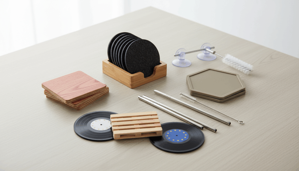 Materialer som kork, træ, silikone og glas giver forskellige look og holdbarhed. Variationerne spænder fra rene nordiske linjer til mønstrede mosaikker og legende temaer. Mange brikker leveres med holder for nem opbevaring, og nogle er sjove eller dekorative som vinylplade- eller EU-paller-inspirerede modeller.