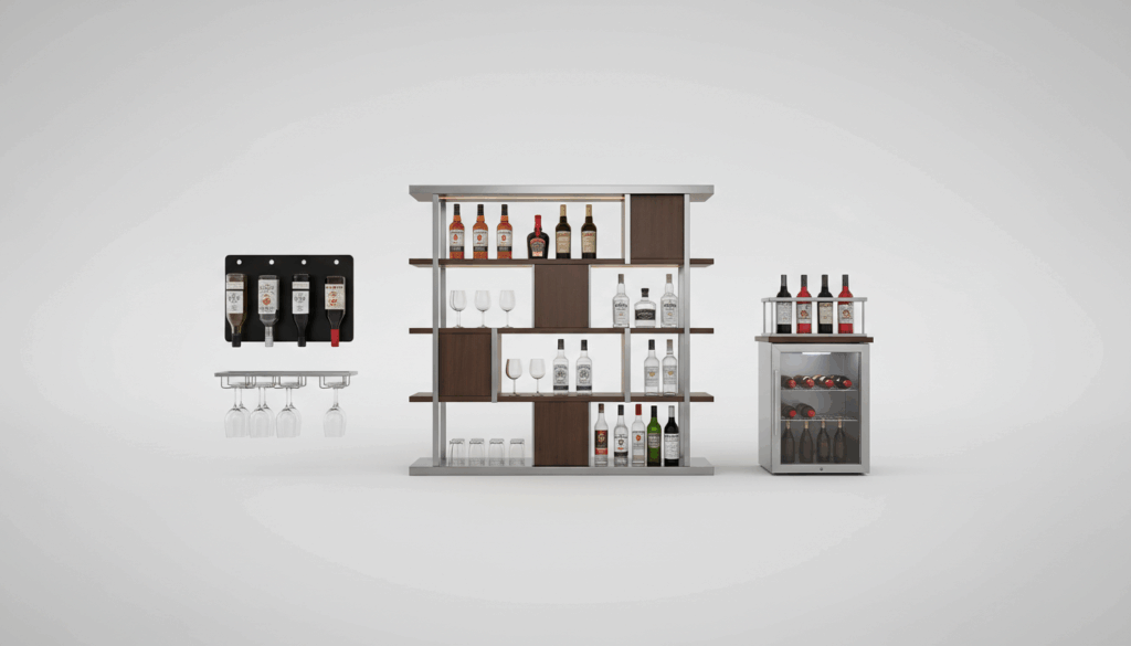 Inden køb bør du måle tilgængelig plads, vurdere kapacitet, monteringstype og finish, samt tænke på, om du vil have enkel adgang til flasker, glas og tilbehør. Hylder og flaskeophæng fås som vægmonterede enheder, glasophæng og fleksible løsninger med justerbare gitre og sider. Eksempelvis findes 1-flaske og 6-flaskers vægophæng samt krom glasophæng og flaskeopsats. Se inspiration og produkter hos Barlife.dk og Nordicbar – alt til baren.