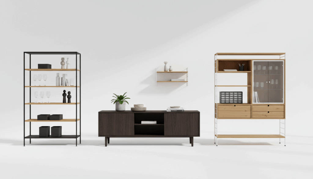 Vigtige overvejelser ved køb er mål, bæreevne, monteringsform og vedligehold. Vælg materiale og finish efter rum og lys: naturtræ til varme, sort stål til industrielt look eller glas til lethed. Beslut om du vil have vægmonteret eller fritstående møbel, og om du vil have justerbare hylder, skuffer eller åbne rum. Holdbarhed og let rengøring er også vigtige faktorer i daglig brug.