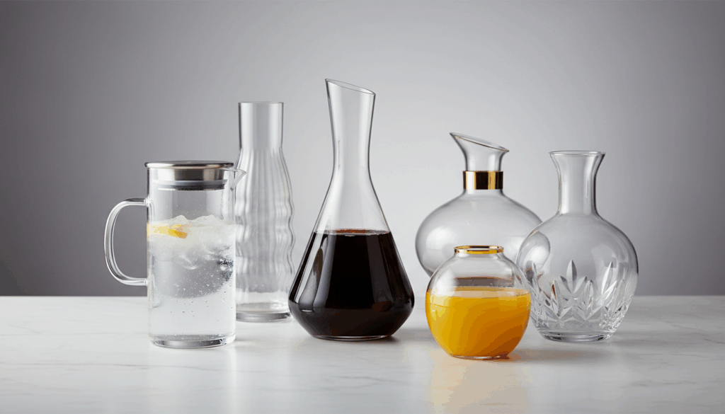 Vin-dekantering ilter vinen og fremhæver aromaer, mens karaffler til vand og juice giver elegant bordservering. Kapaciteterne ligger typisk fra 1 til 2 liter; formen kan være traditionel eller moderne, med ergonomisk hank og nem hældning. Overvej materiale: krystal giver glans, borosilikat er holdbart, og glas passer til opvaskemaskinen.