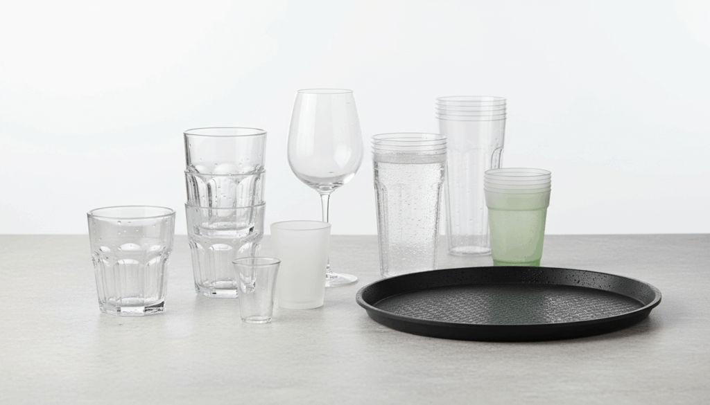 Variationer og anvendelser spænder fra 4 cl snapseglas til 100 cl festivalkrus, vin- og cocktailglas i forskellige størrelser. Polycarbonat er brudsikkert og gennemsigtigt; Tritan er ridsefast og PP let og prisvenligt. Mange modeller er til udendørs brug og tåler opvaskemaskine. Miljøvenlige produkter findes som bionedbrydelige eller genbrugelige løsninger.