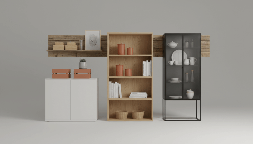 Materialer og finish varierer: massivt træ som eg giver varme og holdbarhed; MDF med overflader i hvidtonet, sæbe- eller oliebehandlede træsorter; metalrammer giver et industrielt look; genbrugstræ bringer bæredygtig æstetik. Dybder og bredder spænder fra små, pladseffektive løsninger til rummelige opbevaringsmoduler; vægmontering eller fritstående muligheder passer til forskellige rum og behov.