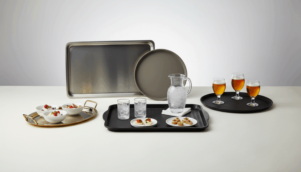 Serveringsbakker er robuste redskaber til transport og præsentation af mad og drikke. Kategorien rummer runde og rektangulære modeller i materialer som FRP, rustfrit stål og PP, ofte med skridsikker gummibelægninger og praktiske håndtag, der gør det sikkert og nemt at flytte varer mellem køkken og bord.