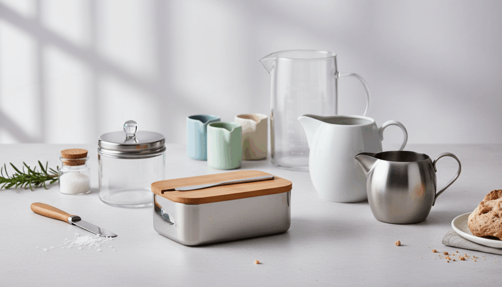 Egenskaberne varierer fra tætsluttende låg og gennemsigtige låg til holdbart rustfrit stål og bæredygtig bambus. Sovsekander giver en hældetud og håndtag til præcis dosering. Nogle modeller inkluderer smørkniv eller låg med målebæger. Glas giver gennemsigtighed, stål lang holdbarhed, bambus varme og miljøvenlighed. Flere sæt fås samlet, hvilket gør det nemt at koordinere bordopstillingen.