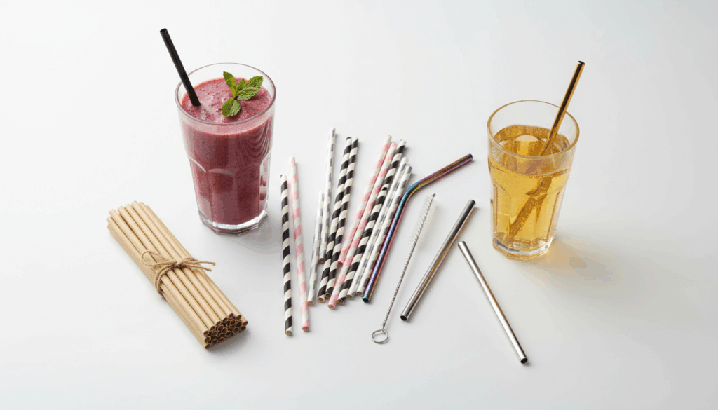 Der findes også genanvendelige alternativer i rustfrit stål, ofte med rengøringsbørste og topopvask. Rainbow Look-stål og guld-/sølvdesigns giver festligt præg, mens papirsugerør fås i sort, hvid, prikket og stribet til særlige lejligheder. Mange varianter er miljøvenlige og bionedrdydelige.