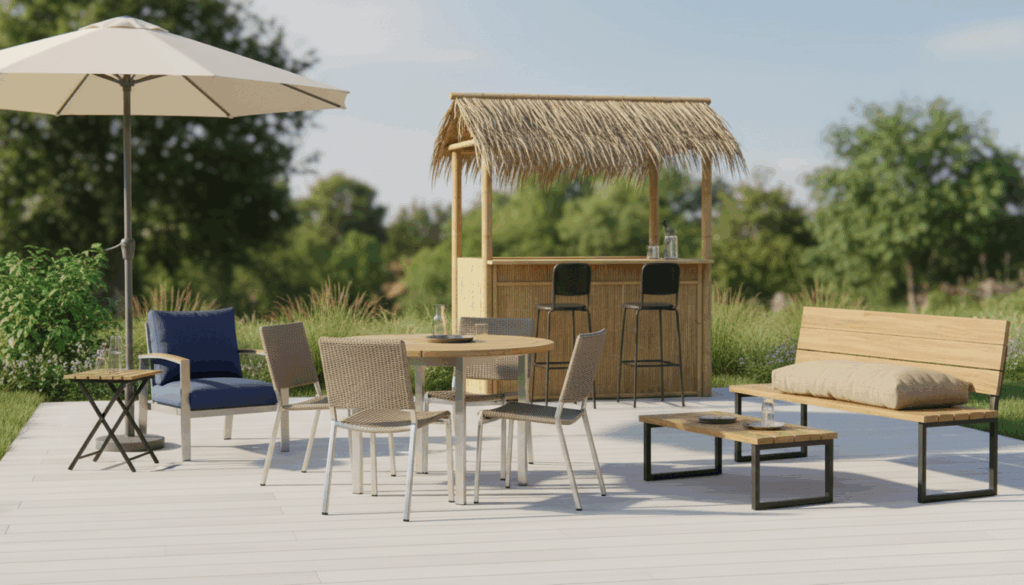 Vigtige overvejelser ved køb er materiale, størrelse og opbevaring. Teak giver varm patina og lang levetid; aluminium er let og vedligeholdelsesvenligt; galvaniseret stål står stærkt i fugt og vind. Mange modeller er foldbare eller lette at flytte, og bordplader i glas eller træ giver praktiske overflader til service og mad. Husk også parasoller og hynder for ekstra komfort.